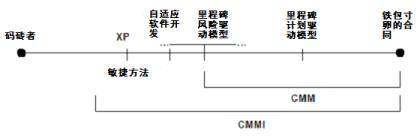 Barry Boehm根据几种过程模型计划性的强弱,描绘了它们在计划谱系中的相对位置 [1] 。可以看到,里程碑风险驱动的RUP位于最极端的敏捷过程XP和里程碑计划驱动的TSP之间。Mark Paulk建议,“应该在组织业务环境中恰当的地方仔细考虑采纳敏捷运动的想法。” [5] CMM、XP是互补的,RUP可以和PSP、 XP集成,XP、ASD与Scrum也天然地相吻合,这些事实都说明重型、轻型过程方法论之间并不存在根本性的矛盾冲突。把这些互补方法论拼在一起,恰好可以发现整个软件过程体系全貌的一部分,可能这就是事物复杂性的原本反映吧。