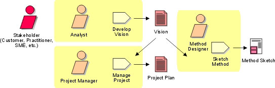 - 方法纲要。 所有重要的候选方法元素和它们之间的关系都被确定。这个方法概述可能还包括一些关键元素的早期描述。这个概述已经被检查并受到赞同;比例,每个候选方法元素将变成一个方法定义的方法元素。
