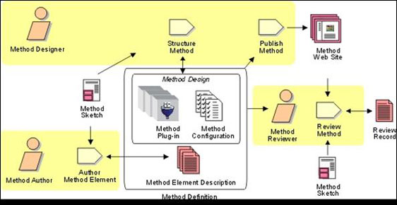 - 方法定义。 方法架构是原始资料。它包括所有重要的结构元素(方法插件包括方法包和方法元素,以及方法配置)和它们之间的关系。它权衡了现有的可用资产。方法设计的定义可能还不够完善。它包括非重要结构元素和它们之间的相互关系。