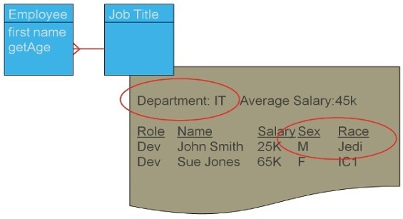 输出中的所有条目都需要存在于领域模型之中。输出只是对模型中数据的展现。输出中展现的每条信息都应该是模型中的一个属性或方法。在上面的例子中,模型中缺失了部门、平均工资、角色、工资、性别以及种族。为了消除这个坏味道,将它们作为属性或方法添加进来。如果缺失添加这些信息的合适实体,那需要添加实体。