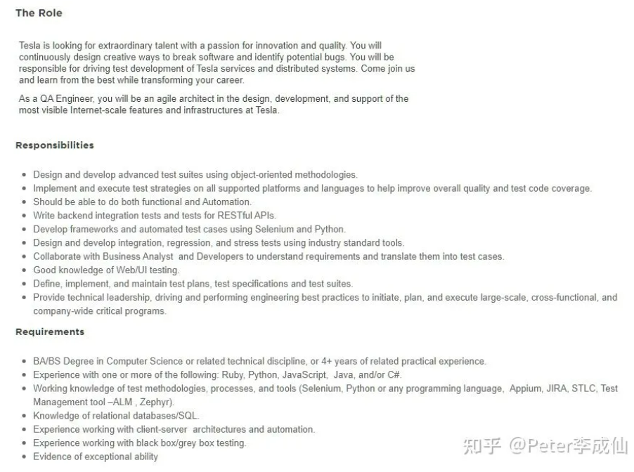 首先,Tesla并未采用ASPICE,下面是Tesla的Software QA Engineer的职位描述,就是测试。如果采用ASPICE的话,则会有专门的人员去保证流程、优化流程。