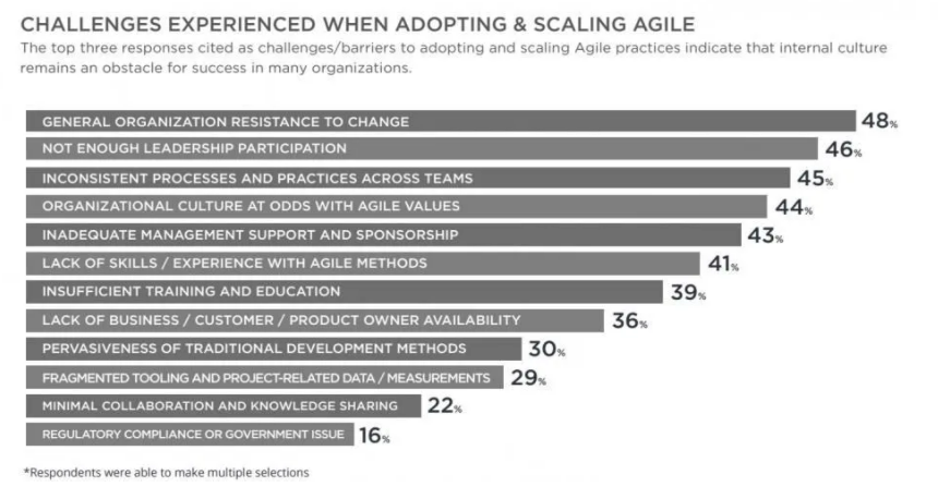 敏捷虽然很好,但要转型成功,挑战不小,以下是来自敏捷年度报告中的统计。