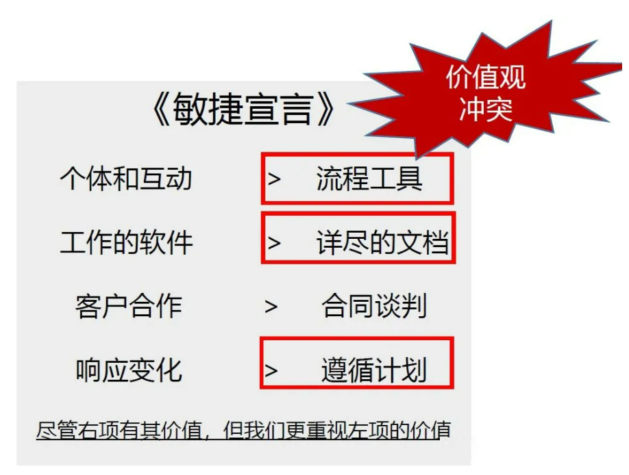 这里特别要强调最下面这句话:"尽管右项有其价值,但我们更重视左项的价值", 并不是说右边没有价值,而是说如果你认同右边的价值的话,左边就更有价值。