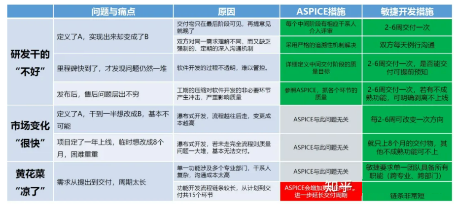 面对第一章的“痛点”,ASPICE确实可以解决质量问题,但对市场变化“很快”毫无贡献,反而还会延长交付的周期。而“敏捷”可以解决所有的“痛点”。