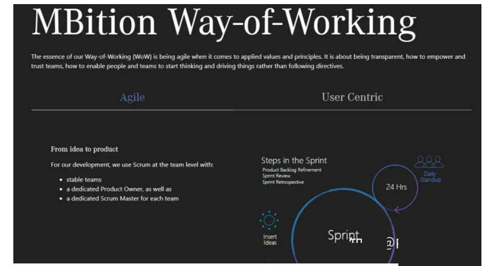 奔驰已经将”敏捷(Agile)的组织文化”写入公司战略[8],并且其子公司Mbition也开始用敏捷的方式生产整车,并要求其供应商也使用敏捷的方式。其主页http://mbtion.io上有一段话