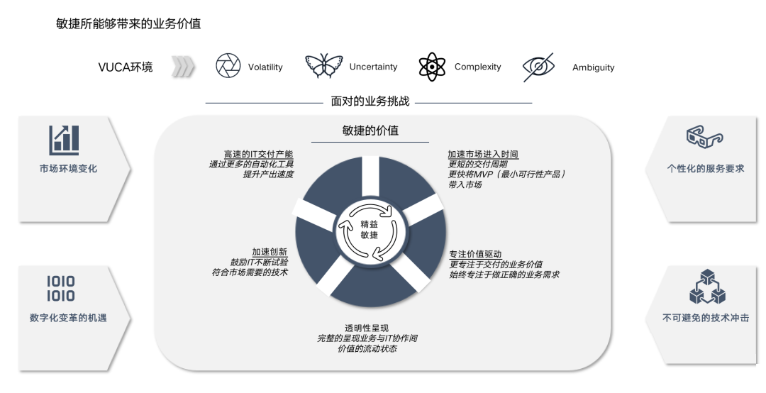 如果一定要回归到敏捷的第一最基本命题,我个人的理解是敏捷是一种可以影响到组织,甚至个人的核心思维方式的改变 -- 组织的迭代式演进,组织能够通过不断的迭代式的试错学习从而调整到一个最适应组织当下的状态。再要追根溯源的话,敏捷背后的动因以我们的调研和学习发现是希望打造一种复杂自适应系统。只有在形成复杂自适应的条件下,对抗外力的变化可能性才能无限的提升。