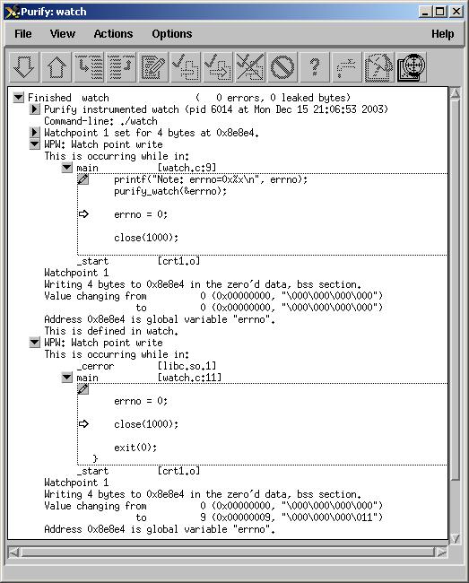 我们可以看到,Purify成功地监控了errno变量。我们还可以看到被监控的变量改变前和改变后的值。