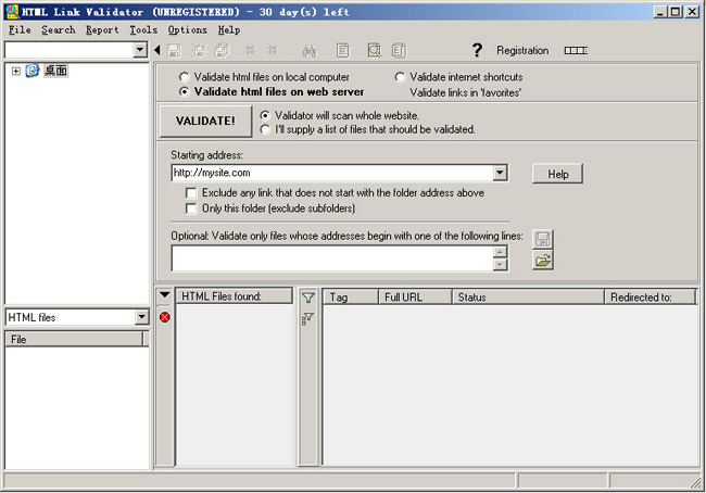 如果要队本地网站进行测试,则直接在左边窗口选择网站所在的文件夹,展开目录的时候请单击目录前面的“+”号图标,因为在Web Link Validat双击有特殊的用途。默认情况下,双击HTML文件则对该文件中的所有链接进行链接测试,双击目录则对该目录和所有