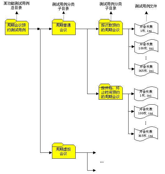 当一个功能有很多组测试数据时,我们可以将测试用例数据全部存放在文件中,使测试用例和测试代码分离开。由于测试用例脱离测试代码而存在,可以很方便的进行管理和维护。我们可以为每个要测试的函数(或功能)建个目录,每个测试用例放在一个单独的文本文件中,将所有对应于该函数的测试数据文件全部放入该目录下,当测试数据量很大时还可以在目录下再创建相应的子目录,分类进行管理。这样可以方便测试用例的管理,而测试程序也只用专注于测试逻辑。还以测试周期会议预约功能的例子为基础进行讨论。