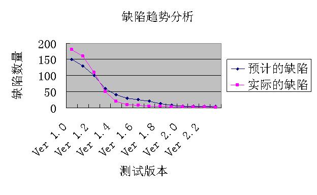 这个缺陷趋势分析图,说明了,软件在测试版本的 Ver 1.4的时候,软件的质量已经得到了很好的控制了,在 Ver 1.8的时候,基本上就已经可以发布软件了,后面的测试几乎是没有什么意义的。原因很简单,软件中的缺陷既然是不可能全部发现的,就不要指望找出软件中全部的缺陷,当它足够少(各公司的定义是不同的)的时候,就应该停止测试了。