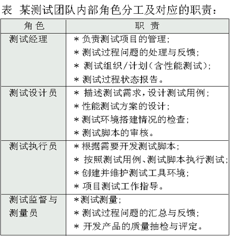 明确测试团队内部各类测试人员的职责分工可以使测试团队内部各类测试人员能集中精力在较短的时间内完成特定岗位必需的知识储备和经验积累,同时也使得测试团队的管理更科学,真正做到“用其所长,避其所短”。这里列出一种可行的测试团队内部职责分工方案,如表所示。
