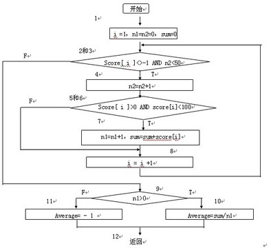 举例说明:流程图描述了最多输入50个值(以–1作为输入结束标志),计算其中有效的学生分数的个数、总分数和平均值。