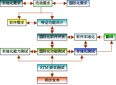 在需求分析阶段,既要考虑软件的功能需求,也要考虑软件的国际化需求。另外,为了缩短源语言开发的版本和本地化版本的发布时间间隔(甚至达到同步发布),国际化版本的开发应该与软件本地化过程同时进行。在测试方面,对国际化版本的国际化功能测试和对本地化版本的本地化测试尽可能同时进行,以便尽早发现和修改国际化设计错误。