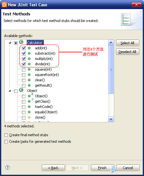 点击“下一步”后,系统会自动列出你这个类中包含的方法,选择你要进行测试的方法。此例中,我们仅对“加、减、乘、除”四个方法进行测试。如下图所示: