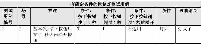 无效(I):这个条件将激活备选流,引发特定场景。C不可用(N/A):所确定的条件无法应用于测试用例。我们来看一个简单的“控制灯”的用例,这里有三个改变系统行为的条件要考虑:D按下按钮少于