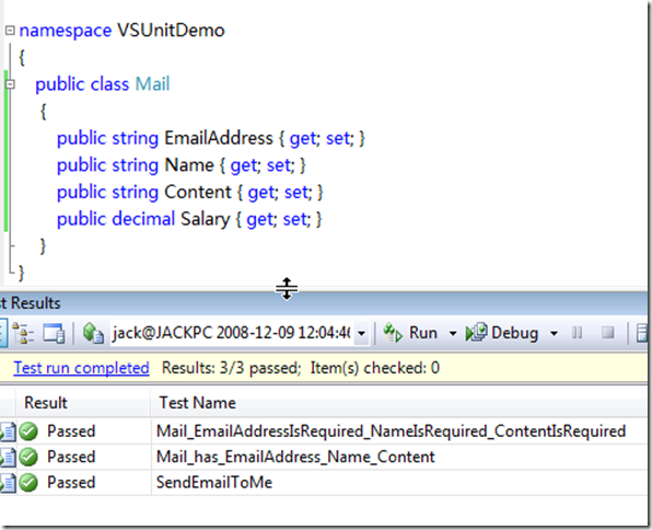 Ctrl+Shift+B编译无法通过,提示无Mail类,我们现在在VSUnitDemo里加入Mail类和相关属性