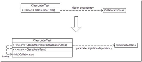 因此可以很方便地增加一个构造函数, 把隐藏式依赖转变成参数注入式依赖. 下面的UML图阐释了这种手法.