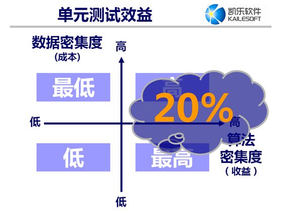 那么,是不是整个项目的所有代码都做了单元测试,才能得到这些效益呢?不是的。80:20规则,在软件开发过程中也存在。也就是说,80%的代码错误,可能存在于20%的代码中;80%的编码、调试成本,可能会消耗在20%的代码上。这20%,就是算法密集度高的代码,也就是功能逻辑复杂的代码。
