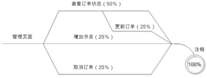 解释:管理员操作都需要从登录管理页面开始,操作最多的是查看订单状态(50%),其中有一半的订单需要修改,增加书目和取消订单都占25%。