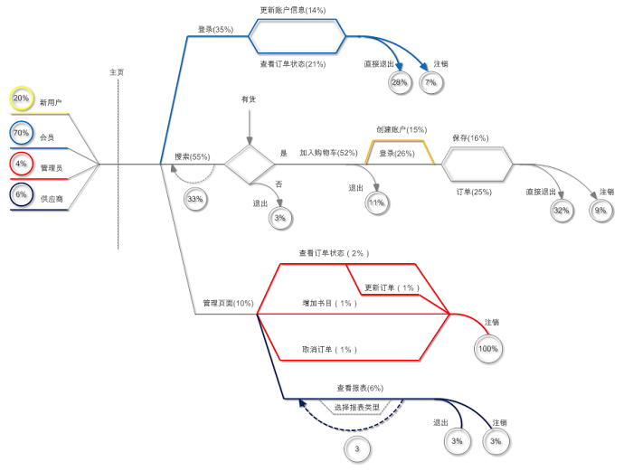 解释:从整体考虑,新用户占20%,会员70%,管理员4%,供应商6%。不同类型的用户通过不同颜色来标识,所有的用户都需要从主页开始访问系统。此模型反应了系统的整体使用情况,也即测试场景需要模拟的压力。而测试场景中具体要执行的测试脚本,则主要根据各类型用户各自的用户模型来开发。