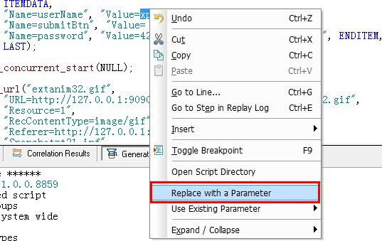 web_url("Login", "URL=http://127.0.0.1:9090/Account/Login", "Resource=0", "RecContentType=text/html", "Referer=", "Snapshot=t1.inf", "Mode=HTTP", LAST); web_find("login Check", "expect=notfound", "matchcase=yes", "onfailure=abort", "report=failure", "repeat=no", "what=页面已删除", LAST ) |