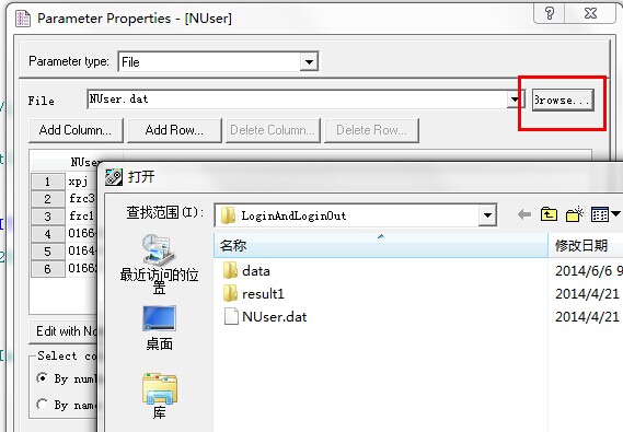 与以前定义的参数取同一行(Same Line As <parameter>):该方法从以前定义过的参数中同样的一行分配数据,但必须指定包含有该数据的列。在下拉列表中会出现定义过的所有参数列表。注意:至少其中的一个参数必须是Sequential、Random或Unique。