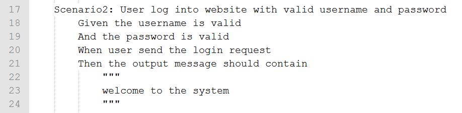 Behavior;之后开发者负责填充这些故事的内容,测试人员负责检验故事结果的正确性。一个比较简单的案例即用户登录场景测试: