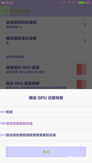 开启方式:设置-开发者选项-调试GPU过度绘制-显示过度绘制区域。开启后的效果如下图: