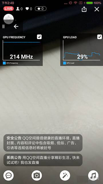 选择“Profile nApp”即可选择监测应用,在Setting中可以选择监测项目,采样频率等高级选项,同时还可以选择开启悬浮窗口实时监测。我们选择监测QQ空间直播过程中的GPU占用情况,并开启悬浮窗口实时监测GPU状态,如下图: