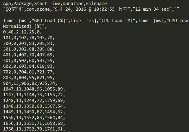 直播结束后,回到Trepn Profiler并选择“Stop Profiling”,会提示是否保存测试结果,选择“Save as .csv”,就可以保存测试过程中每次采样获得的原始数据。从手机中将csv格式的原始数据捞出来,可以用excel打开或者文本编辑器打开,可以根据后续需要自行选择数据处理方式。