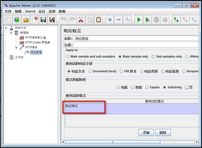 8.设置检查点:在被测接口对应的“HTTP 请求”上,添加“响应断言”: