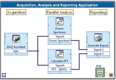 VI(虚拟仪器或程序)的范例,它可以用来从一个仪器采集信号,对数据进行分析,然后将结果生成报表给用户。