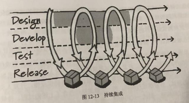 敏捷团队需要代码管理和持续集成(如图12-13所示),有效测试的前提是知道自己在测试 什么。如果测试团队无法配置代码,则测试工作无法开展。在短期迭代的模式下,团队成员至少每天一次导入自己的工作,每一次的集成必须通过自动化测试进行验证,例如使用Jekins实现持续集成。实现持续集成是敏捷团队中优先级最高的事情,必须每日构建用于验证和交付的版本。