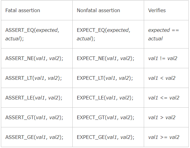 断言常常成对出现,它们都测试同一个类或者函数,但对当前功能有着不同的效果。ASSERT_*版本的断言失败时会产生致命失败,并结束当前函数。EXPECT_*版本的断言产生非致命失败,而不会中止当前函数。通常更推荐使用EXPECT_*断言,因为它们运行一个测试中可以有不止一个的错误被报告出来。但如果在编写断言如果失败,就没有必要继续往下执行的测试时,你应该使用ASSERT_*断言。