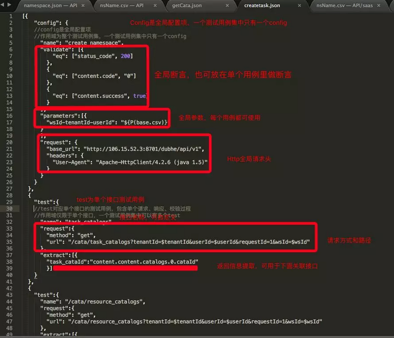 2)HttpRunner使用json/yaml格式处理测试用例,分离后的用例描述如下