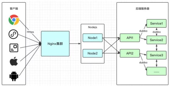 后端服务器:电商系通用的Java微服务架构,API1和API2是接入层,涉及逻辑主要是请求转发和非业务相关的通用处理。Service1这一层才是真正的业务逻辑层,大概有30多个微服务应用,互相之间使用dubbo协议通信。