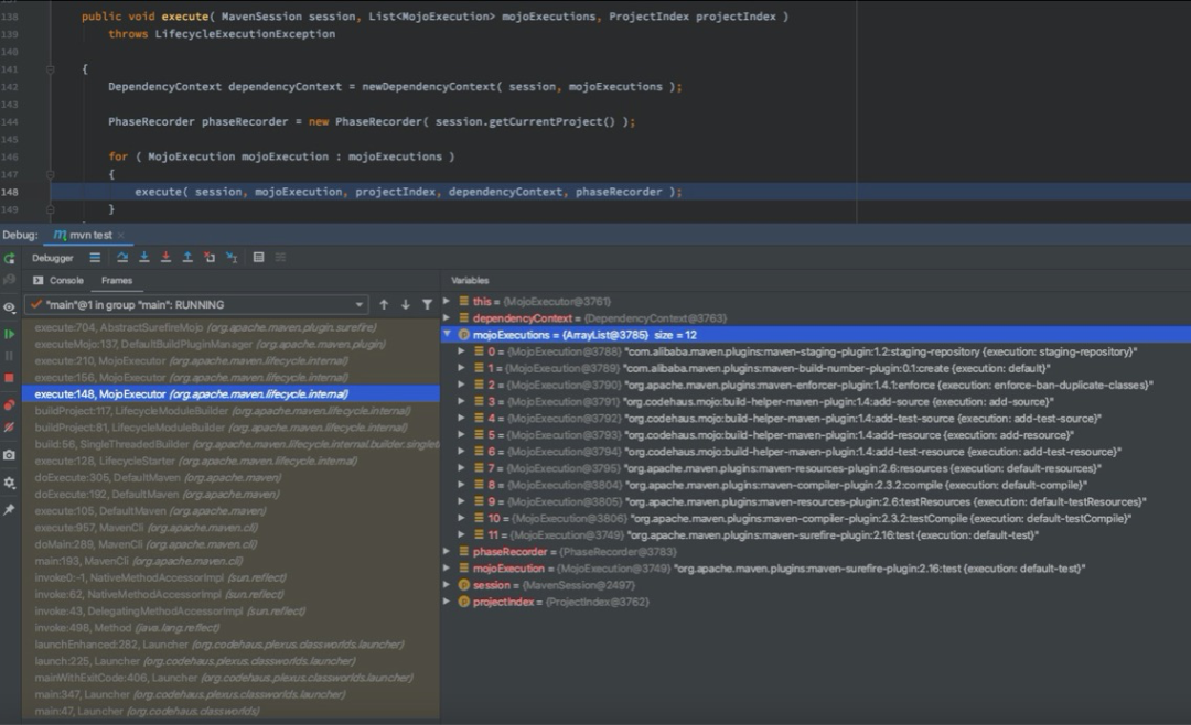 - 当运行 mvn test命令时,先运行 test 阶段之前的 compile、test-compile 等 phase 及绑定 goal 任务;