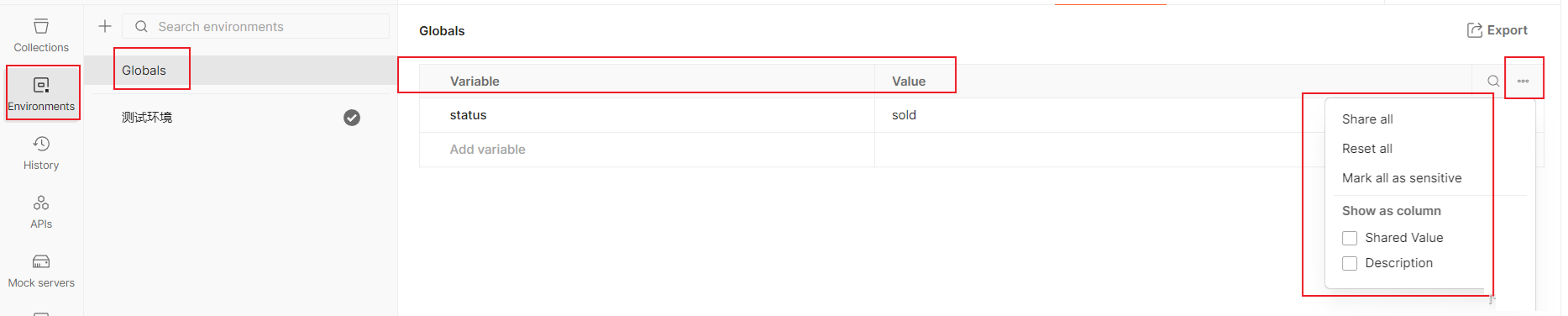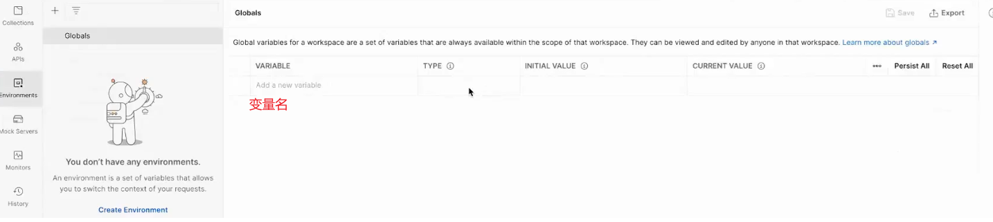 设置方法:postman左侧边栏Environments -> Globals