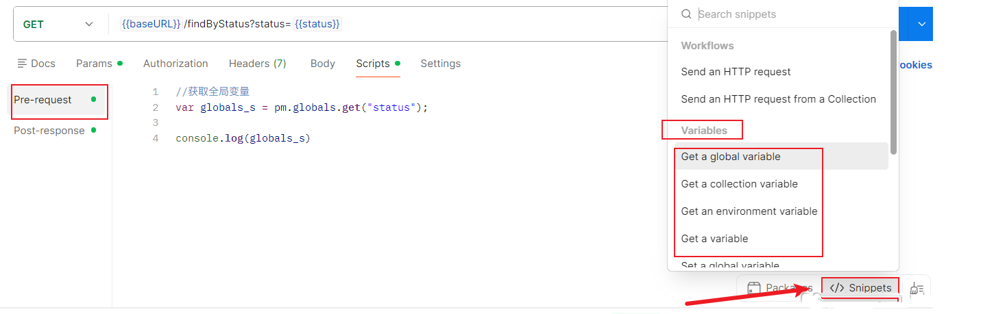 寻找:Scripts中的Pre-request/Post-response中的右下方</>Snippets点击即可
