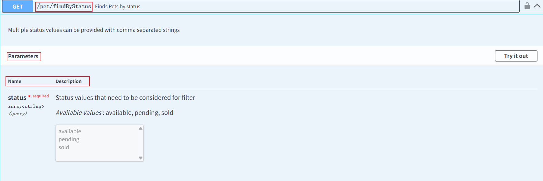 点击GET请求: 可以查看请求参数的名称-Name,参数描述-Description