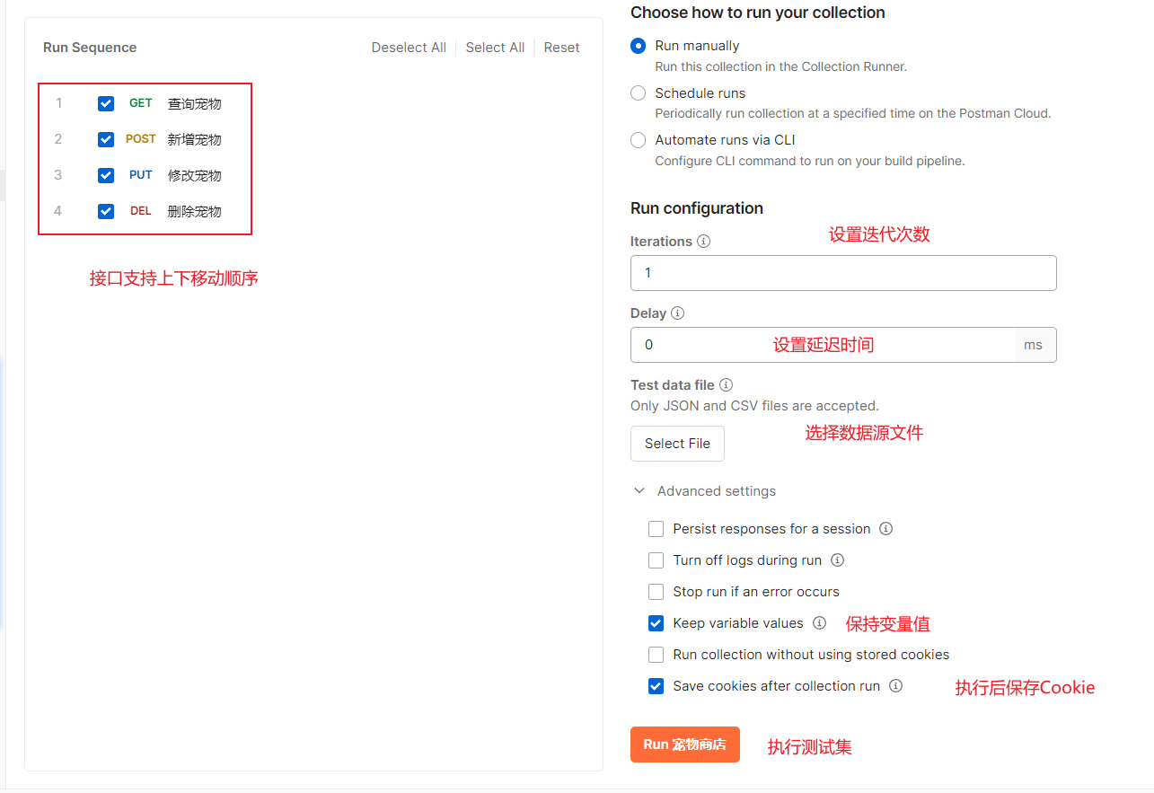 Postman: 创建测试集 → 创建不同功能模块文件夹 → 接口用例创建(GET,POST,PUT,DELETE等)