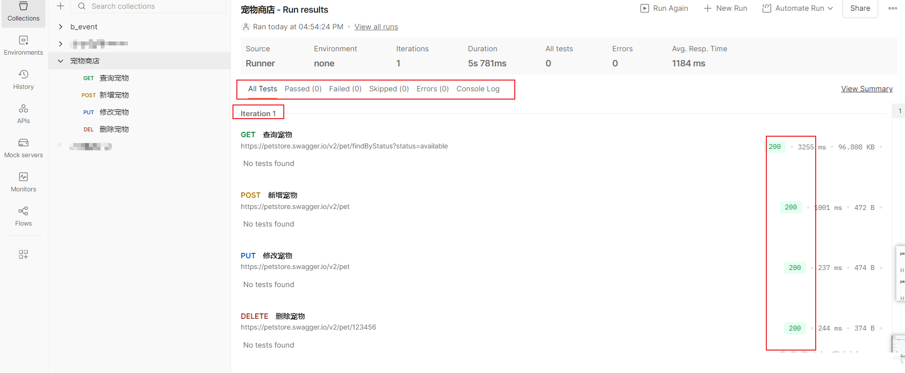 运行后可查看结果:点击任意一个接口,可以查看响应,请求头信息和请求信息