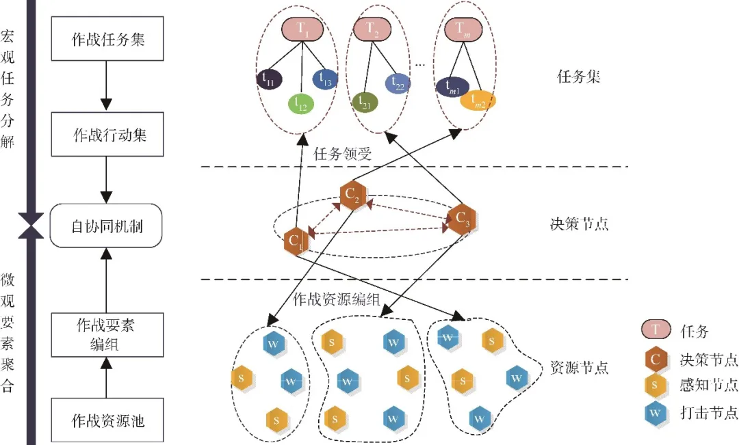 图2中自上而下通过宏观任务分解,将多样化的作战任务需求分解成可执行的作战行动,明确其对应的作战能力要求。自下而上进行作战资源的功能选配和动态组合,为上层的作战能力要求提供具体实施路线。根据作战任务需求,组织不同空域分布的感知、决策、打击节点资源形成任务编组,决策节点间通过分布式自协同形成传感器感知策略、武器打击策略,逐步实现异类信息融合、态势分析和攻击决策等,驱动各平台按照指令开展和实施作战行动,进而遂行完成作战任务。