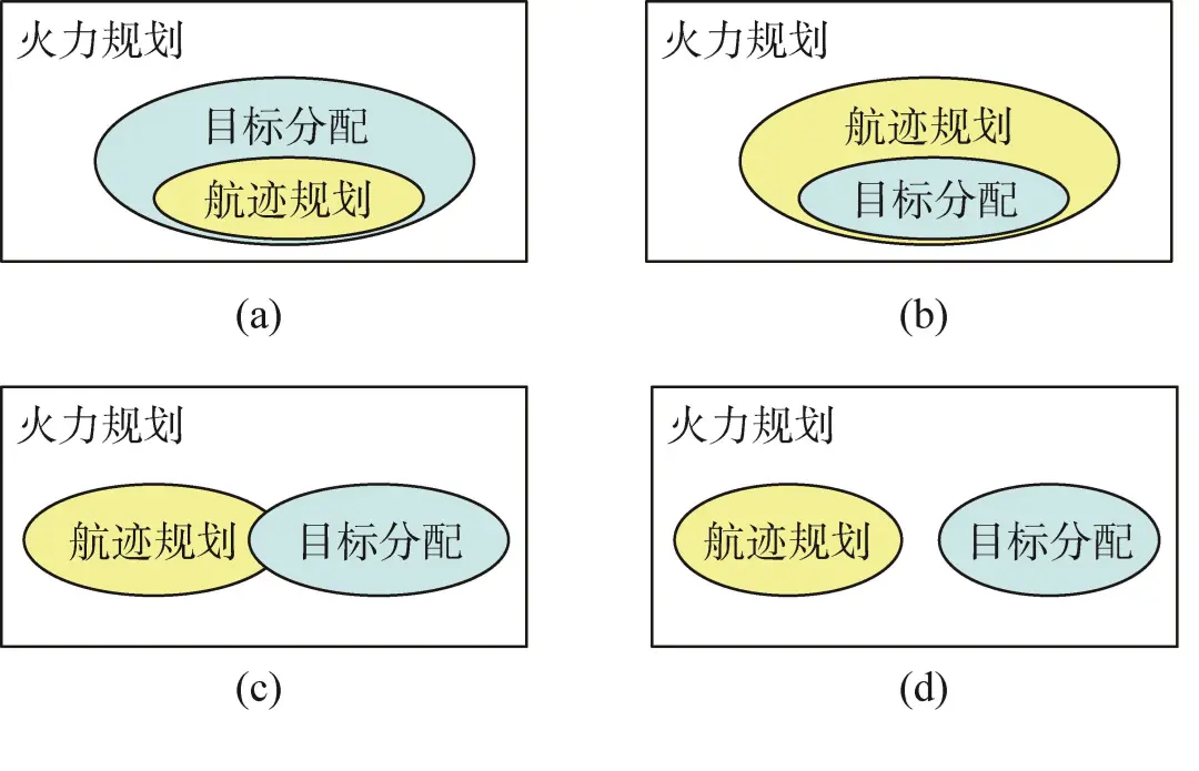 多无人机协同火力规划是根据火力任务规划的优先级评估结果,为待打击目标分配合适的武器进行打击,对察打无人机的路径进行规划和修正,确保以最小的代价实现最大的收益。多无人机协同火力规划隶属于无人机任务规划领域,是强耦合特性显著的复杂多目标优化与决策问题。其中,耦合是指两个问题的求解过程存在公共的变量,或受制于公共的约束条件,如目标分配问题优化指标中武器能力与无人机位置强相关,而航迹规划问题则是以目标分配结果为输入条件,二者互为输入互相约束。多无人机协同火力规划中存在诸多耦合问题,如任务间、约束间、平台间耦合[45],影响协同火力规划优化结果。图4给出了目标分配与航迹规划子问题的求解思路,集中式求解如(a)、(b)所示,分布式求解如(c)、(d)所示。