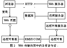 Web传输模式除了使用HTTP负责客户端和服务器的通信之外,还可以使用IIOP和DCOM等协议以支持分布式对象系统。Web页面通过远程对象桩和远程对象传输协议与远程对象服务器通信,由服务器管理远程业务对象的生命周期,向客户端对象提供服务。图2显示了各组件之间的关系。