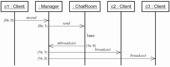 管理器产生输出,它可以访问通信过程中的所有信息。ID为0的客户在时刻10.5发送了一条消息。根据协议,1号聊天室在一秒钟后把该消息广播出去。另一个连接在1号聊天室的客户1在同一时刻收到消息。这里也可以看出消息的最初发送者。
