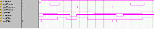 从上面的后仿真时序可以看出,当sensor_l变低时,dira和dirb同时变低,只有当方向信号dir改变时,dira和dirb才随之改变。sensor_r的变化同sensor_l相似。仿真时序中比较关键的一段是sensor_m两次变低的情况,分别代表顺时针和逆时针归零的两种情况。从上图可以看出,所设计的状态机很好的实现了对传感器同一边沿信号的识别,同时在加入了控制信号pwm后,使得机构归零后还可以进行任意方向的运动,满足了设计要求。