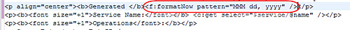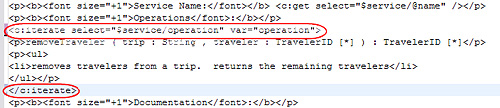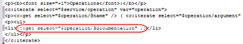 <%-- begin custom variables for $service (1) --%> <c:if test="not ($service/@documentation)"> <c:set select="$service" name="documentation" >No documentation provided</c:set> <c:/if> <%-- end custom variables for $service (1) --%> |