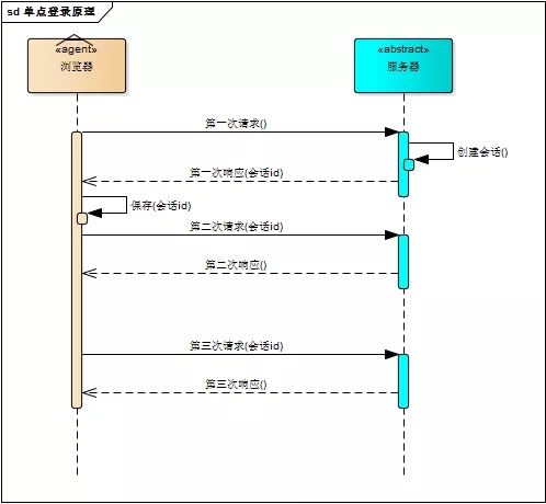 浏览器第一次请求服务器,服务器创建一个会话,并将会话的id作为响应的一部分发送给浏览器,浏览器存储会话id,并在后续第二次和第三次请求中带上会话id,服务器取得请求中的会话id就知道是不是同一个用户了,这个过程用下图说明,后续请求与第一次请求产生了关联。