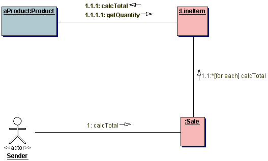 要达到某个特定的目标,必然要执行一系列的方法调用。UML序列图的典型用途就是显示出方法调用过程。图二显示了一个交易事务中计算累计金额的序列图,调用从Sale类的calcTotal()方法开始,相关的代码片断在序列图之后给出。